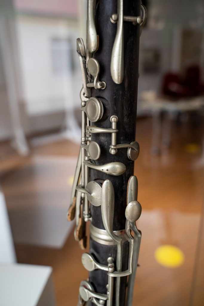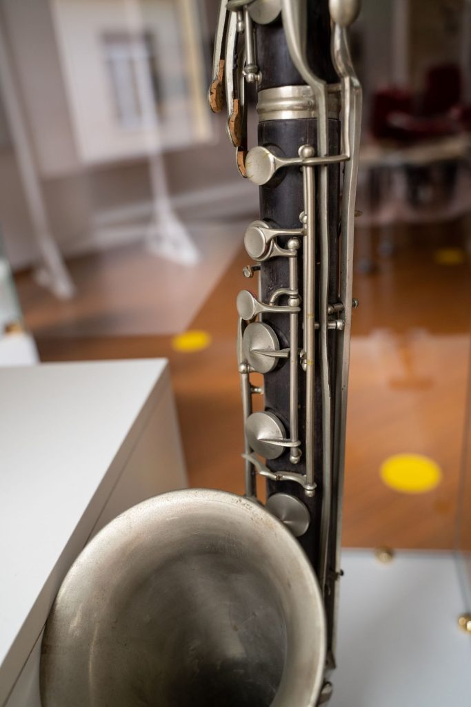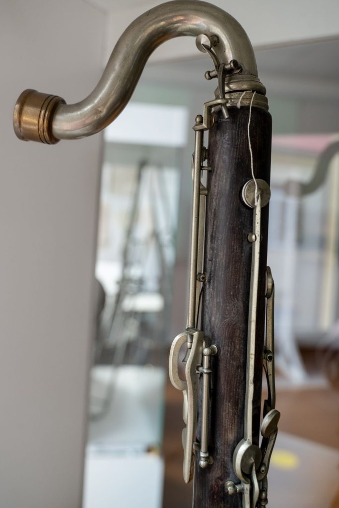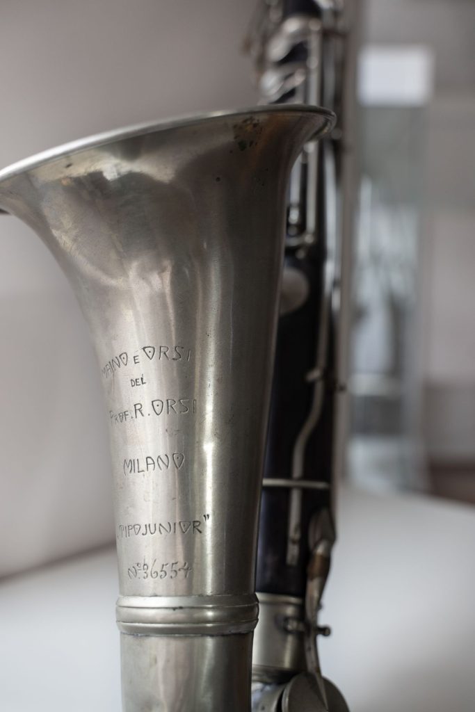 CLARINETTO BASSO SIB costruito nel secondo decennio del XX secolo e marchiato “MAINO & ORSI”. Lo strumento ha il corpo superiore e inferiore in ebano mentre collo e campana sono metallici. Ha ventidue chiavi con tre portavoce e la meccanica Müller