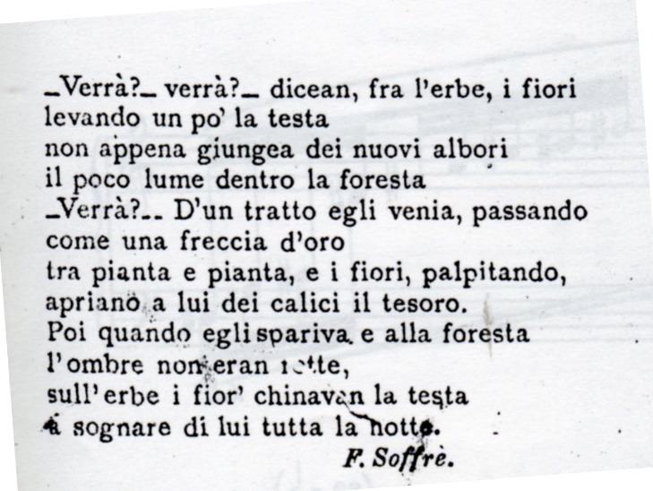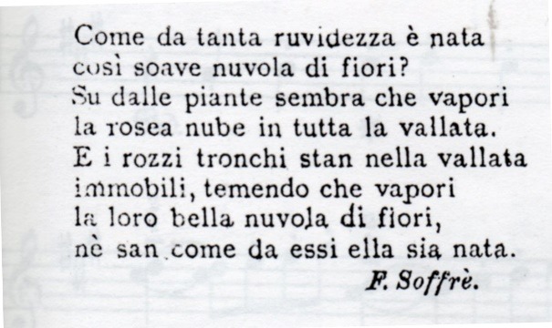 Non sappiamo fino a che punto questa affermazione sia documentata, quello che è certo e che a Delianuova il Cilea trovò l’ispirazione e le parole per alcune sue opere, musicando infatti ben quattro poesie del nostro Felice Soffrè: “Nel ridestarmi”, “Valle fiorita”, “Acque correnti” e “Sole”, meglio conosciuta come “Verrà”. (queste ultime tre poesie facevano parte di un unico poema lirico del Maestro Cilea: “Tre pezzi Op.43”.