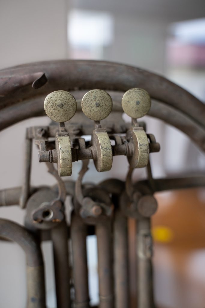 CORNO FRANCESE IN MIB costruito nella prima metà del XX secolo dalla ditta “Ferdinando Roth” Milano. Acquisita da Antonio Bottali nel 1898 ne continuò l’attività mantenendo per un breve periodo il marchio: ” Ditta Ferd. Roth Flli. A.M. Bottali”, in seguito aprirono una succursale all’indirizzo: Piazza Andrea Doria 6. I Bottali oltre l’attività di Ferdinando Roth rilevarono le attività di Luigi Alziati e di Giuseppe Pelitti. Questa ditta fu attiva dal 1870 ed eccelse nella produzione di ottoni. Lo strumento è in ottone cromato con ghiere e rinforzi in ottone nichelato e presenta tre valvole rotanti azionate da tasti in metallo argentato